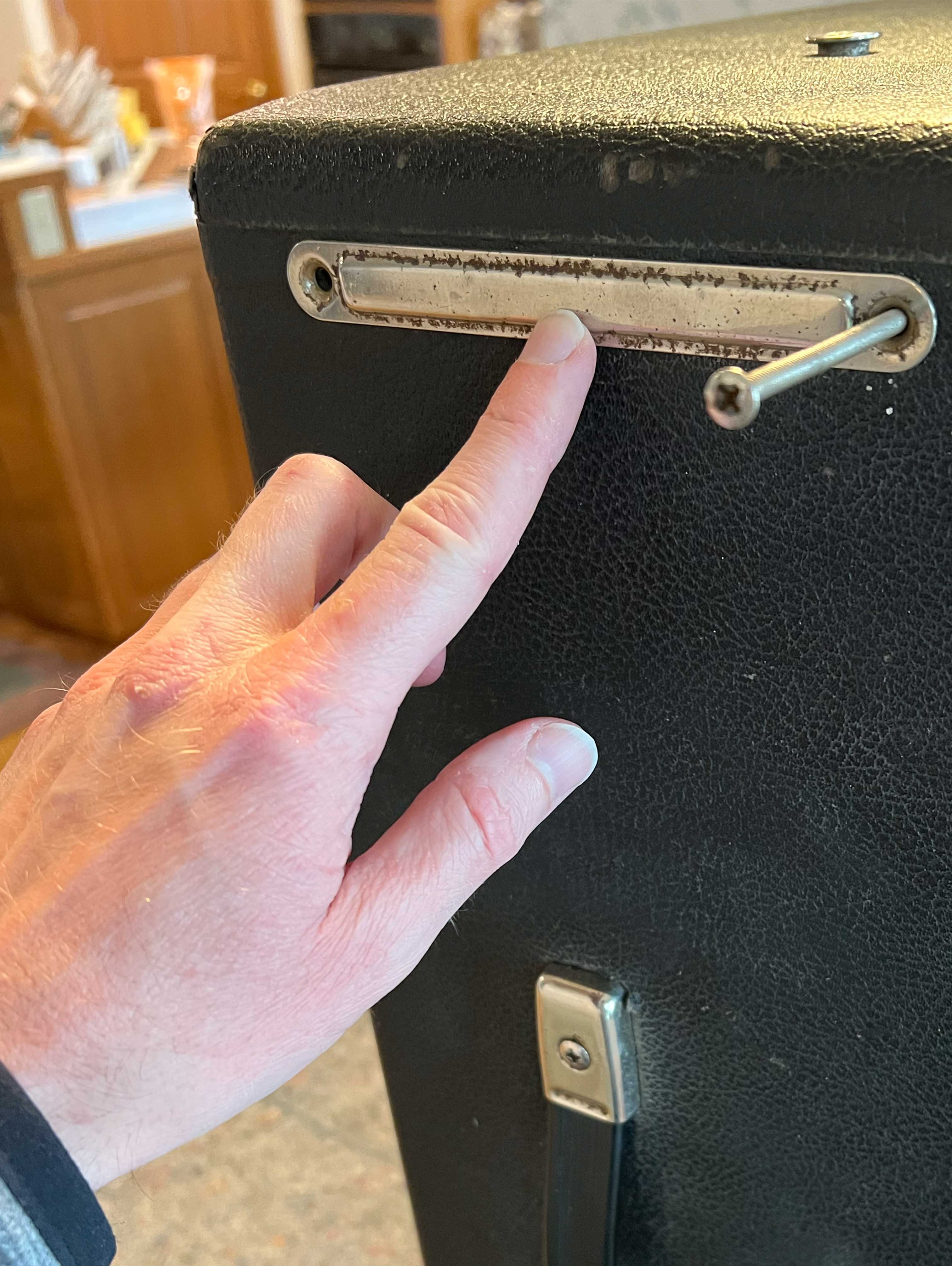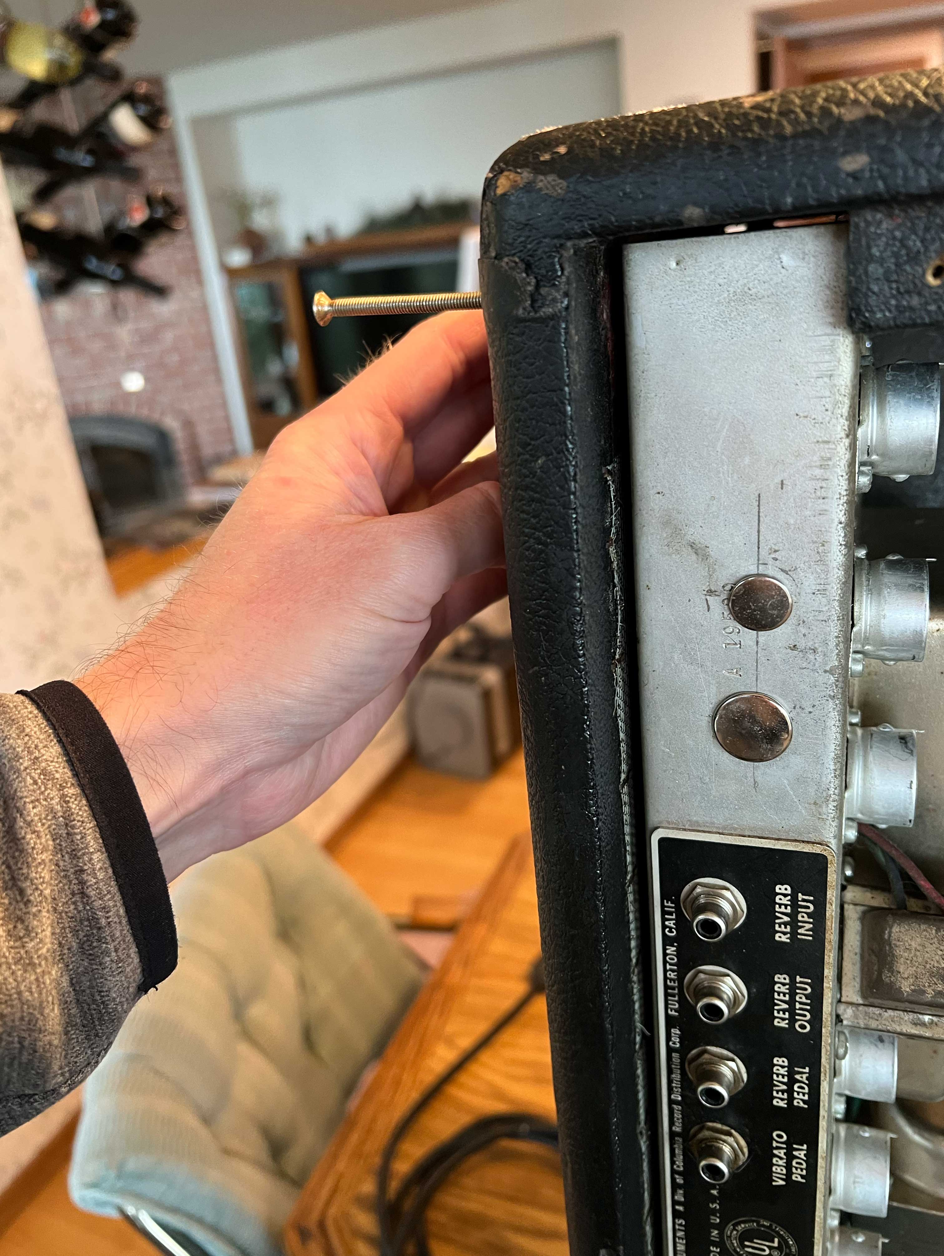 If the chassis does not want to come out, don’t force it. When I got the Super Reverb it had a very common problem on vintage black and brownface amps - a bent faceplate. I straightened it out with a pair of iron bars, C-clamps, and a towel to protect the paint on the front of the panel, so there are techniques to repair faceplates, but it’s better to avoid bending them in the first place. Perhaps not surprisingly, I found the probable cause after removal. The grille cloth was bent over with an extra layer on top at the corners. Bent faceplates are frequently caused by improperly pulling a chassis.