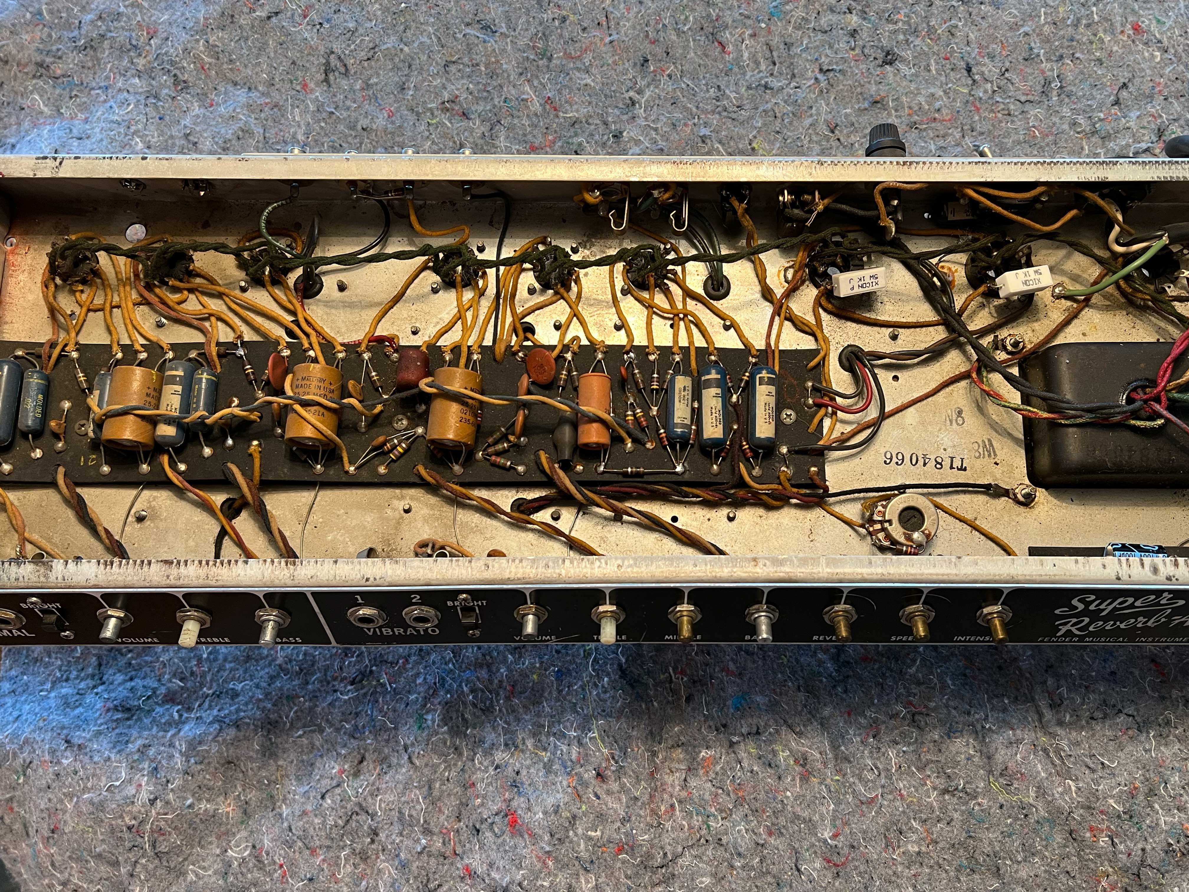 The reverb tank was also removed (not shown). As I wanted to inspect it for originality after the sale, this was done early on. While not terribly expensive to replace, original ones would be and the tank is little more than some springs with a couple transducers and tiny wires. While these regularly survive tour buses, cargo, and decades of use by players, the original tank was not about to become damaged on my watch for lack of adequate shipping preparation, so it was removed and treated to the same level of care as tubes.