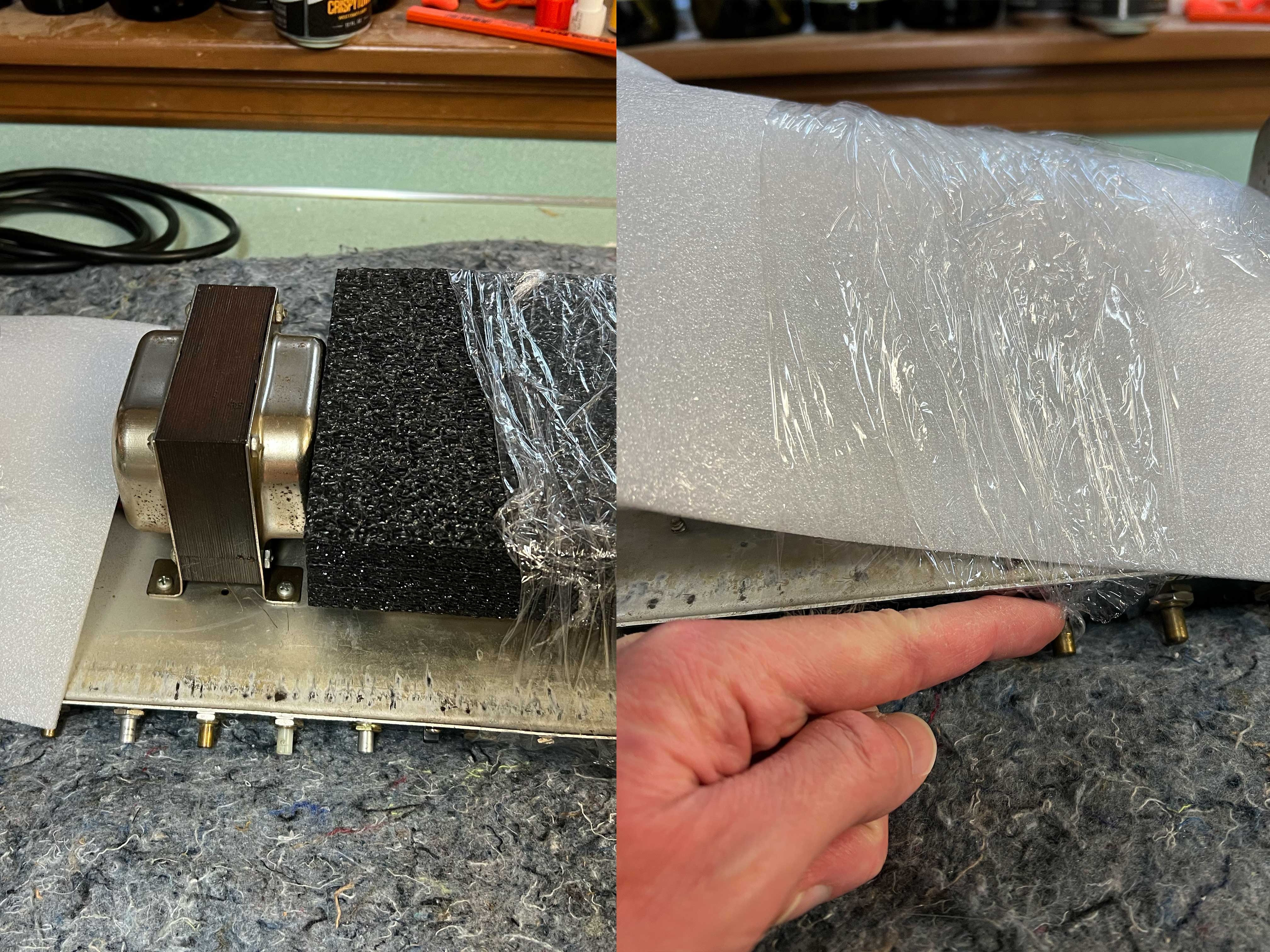 Padding was placed over the power transformer and secured with stretch wrap (https://www.uline.com/BL_5401/Goodwrappers-Mini-Wrap). You want to be careful about not using tape around amplifier chassis faceplates or back panels, where an innocent application could cause unintentional damage. Also notice in the photograph that the stretch wrap was deliberately broken to provide a hole for the potentiometer, and that the doghouse where the filter capacitor reside was padded with thick foam, leaving the output transformer in the center all that was exposed.
