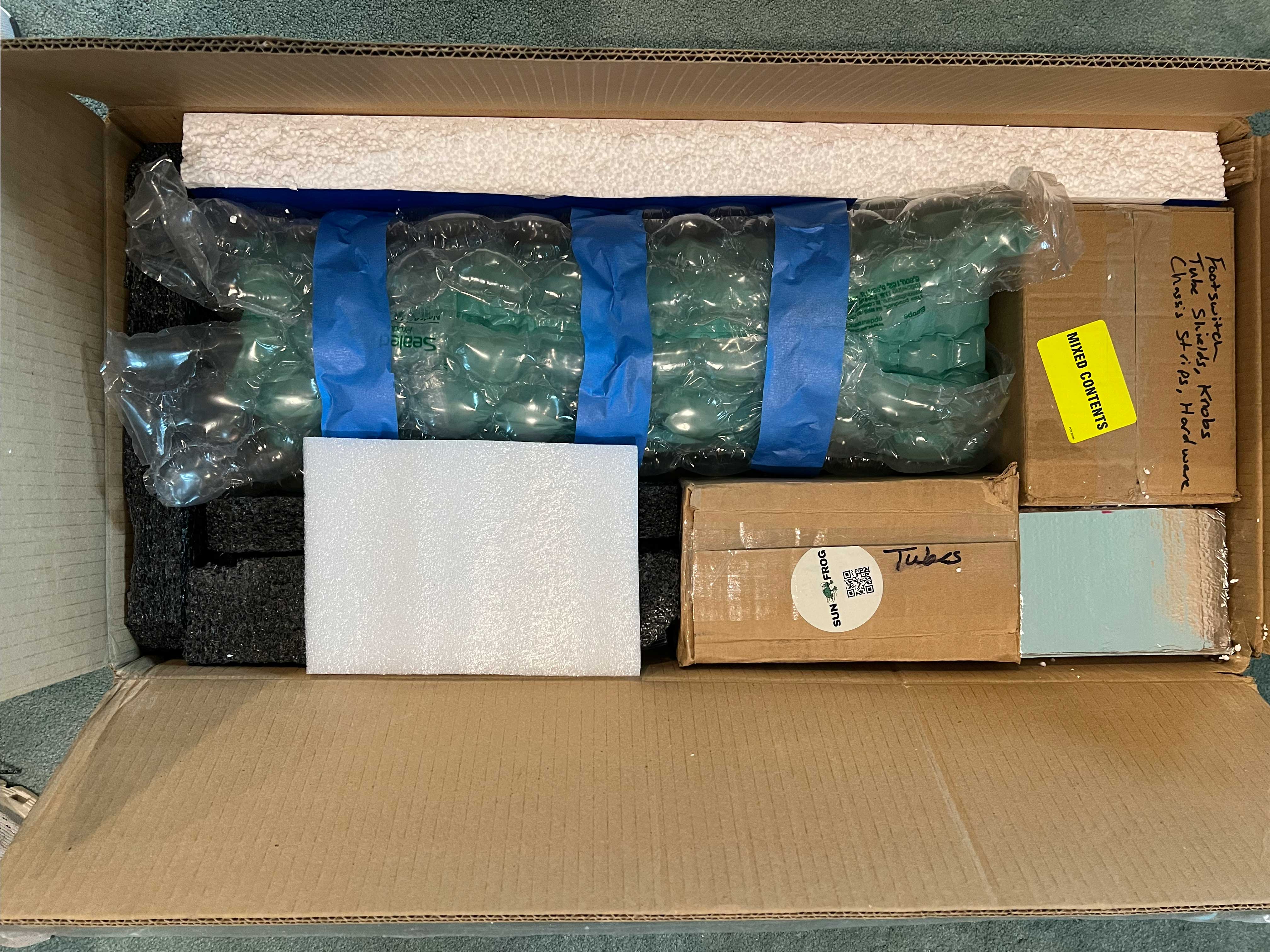 The reverb tank was wrapped in bubble wrap inside of the tank bag with the footswitch and other items in another separate box. The idea here is not only to avoid shifting items, but to take additional precautions to reduce the chances down to zero of anything rolling around and impacting anything else in the box.
