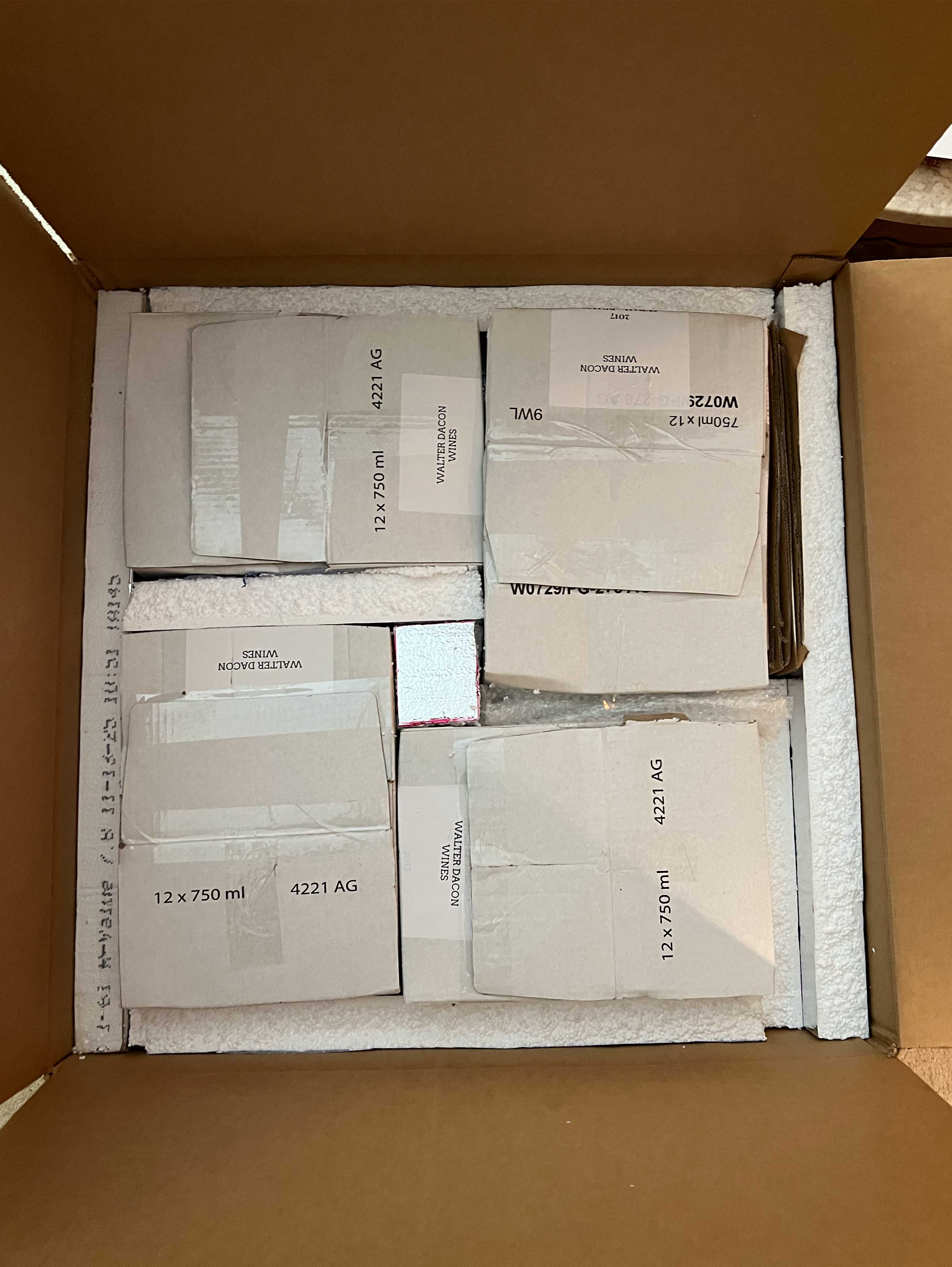 Then with the CTS speakers packaged (well) in old wine boxes shaped down to size with the carton sizer tool, they went on the top layer. Recalling that shifting is as bad as dropping, size the foam to fill the gaps: