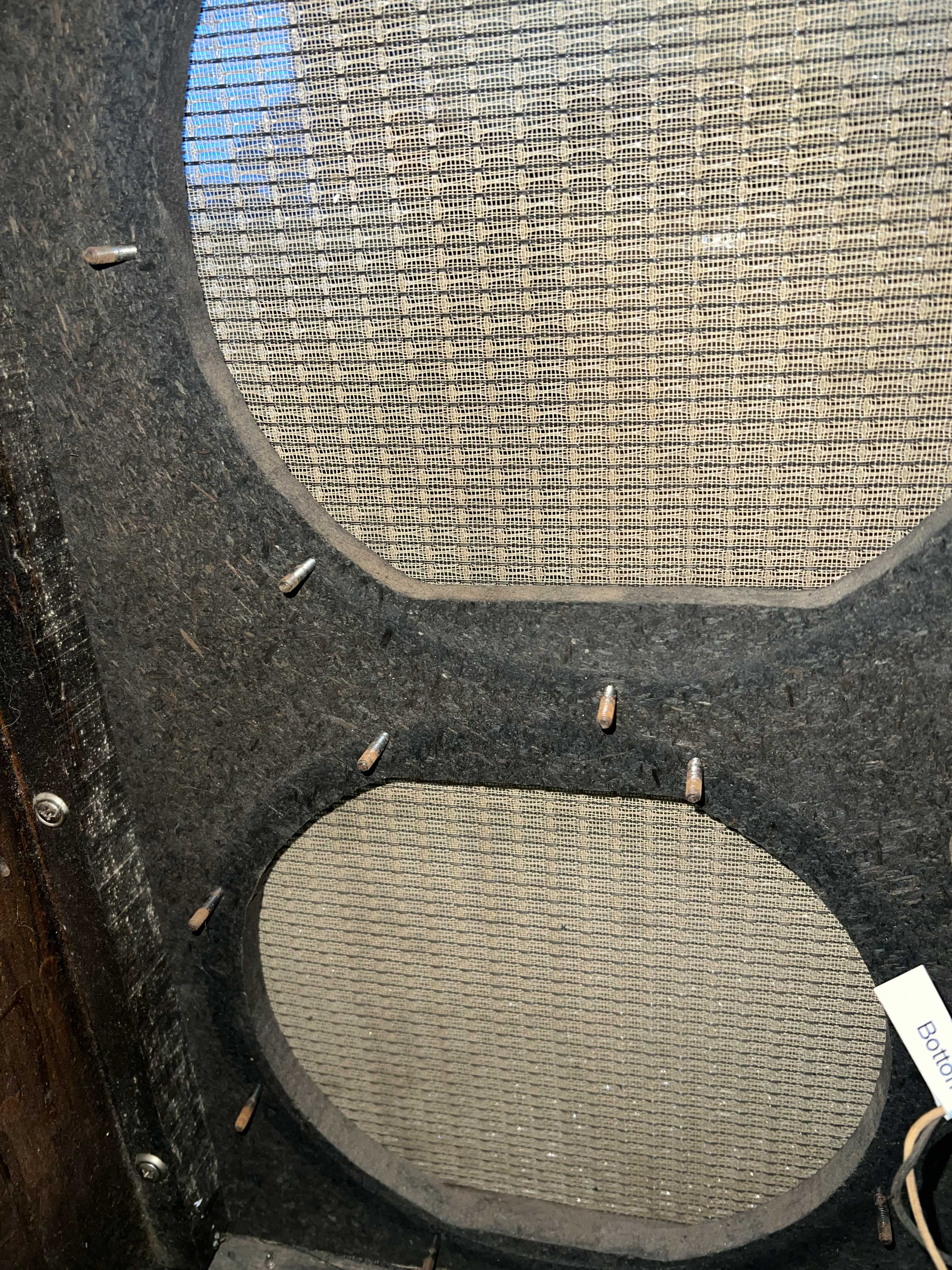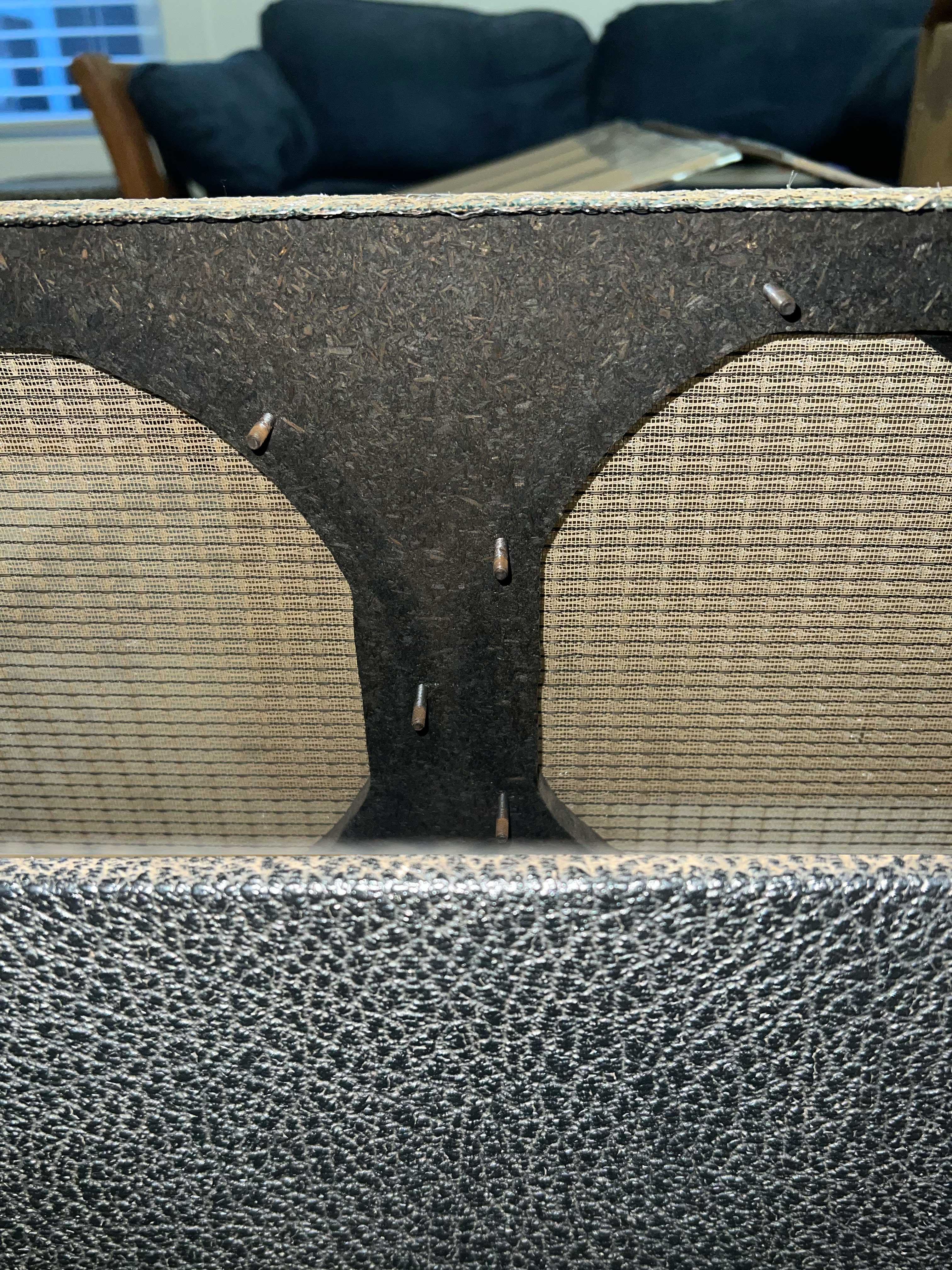 Will Dyke at Amarillo Amp Works was extraordinarily gracious with his time and did not have to even reply to an email (AER Amplifiers in Germany and T-Rex in Denmark are both on my never do business again with list). But not only did Will write back, he answered all my questions and verified the integrity of the cabinet as-purchased. The grill cloth was the obvious issue from the beginning. Depending on how in love I fall with the amp or not after servicing it, he will be the guy to build a replacement baffle board and relic the grill cloth…there are photos on his website and the work he does is extraordinary. Here is the original front with either coffee or beer stains (the owner couldn’t remember which) still visible.