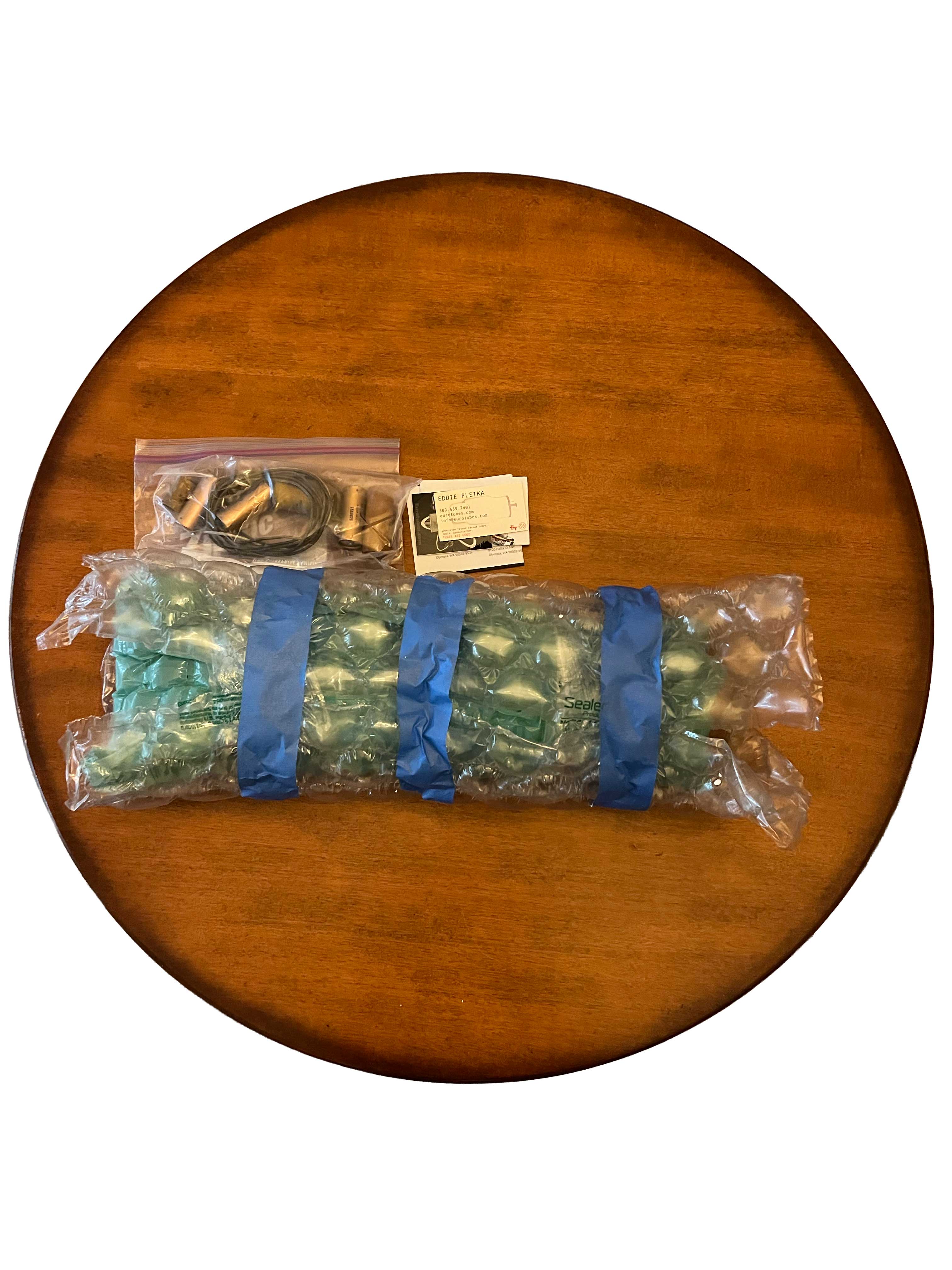 The reverb tank and original parts were placed on the table next to the Eurotubes business card.