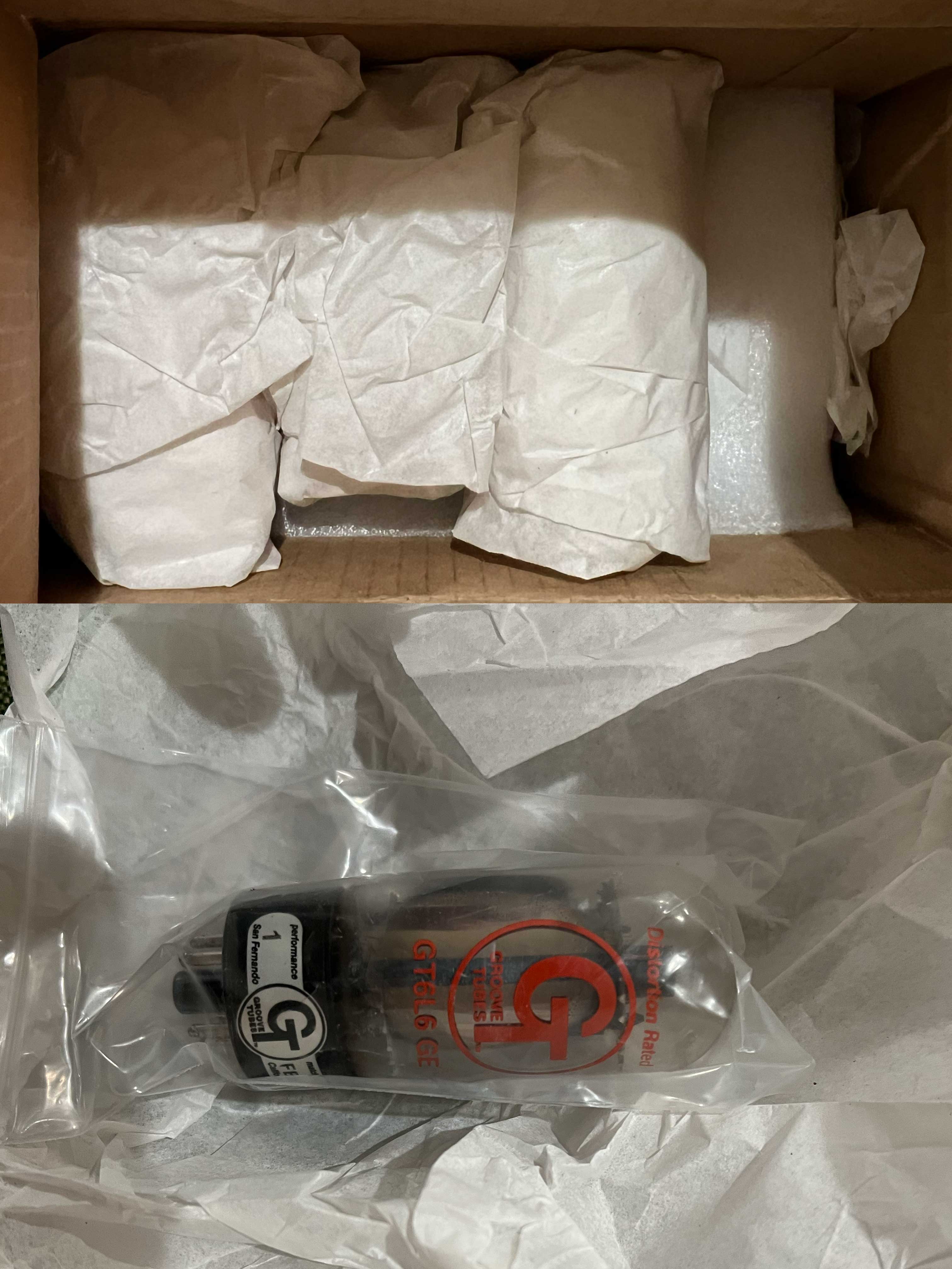 As for the tubes individually wrapped and padded within their inner box, here’s an unwrapped 6L6GC beneath an image showing the rest of the tubes still padded. The tubes got here like a Champ (pun intended to Leo’s early model, the tweed Champ!). No broken glass.