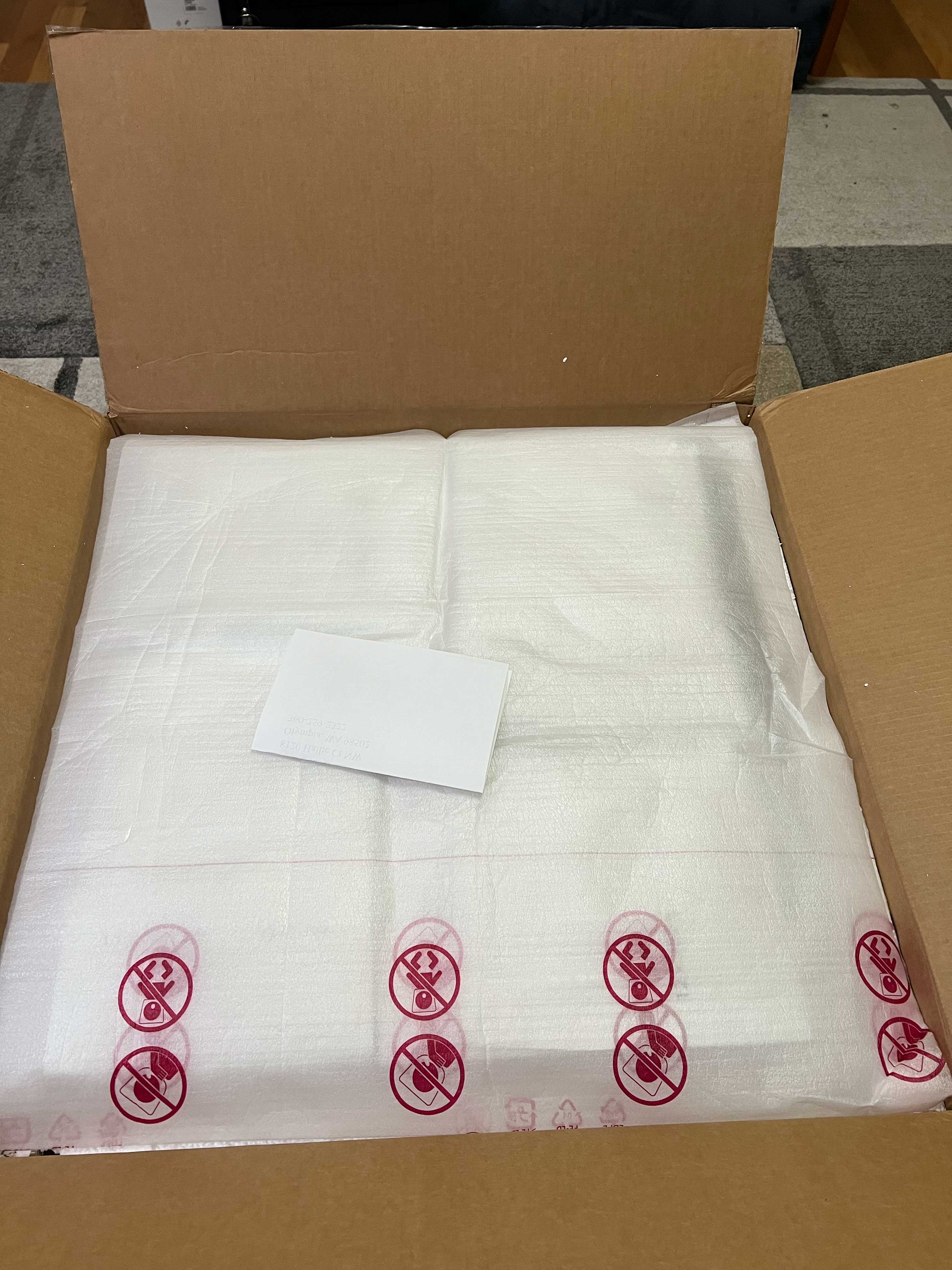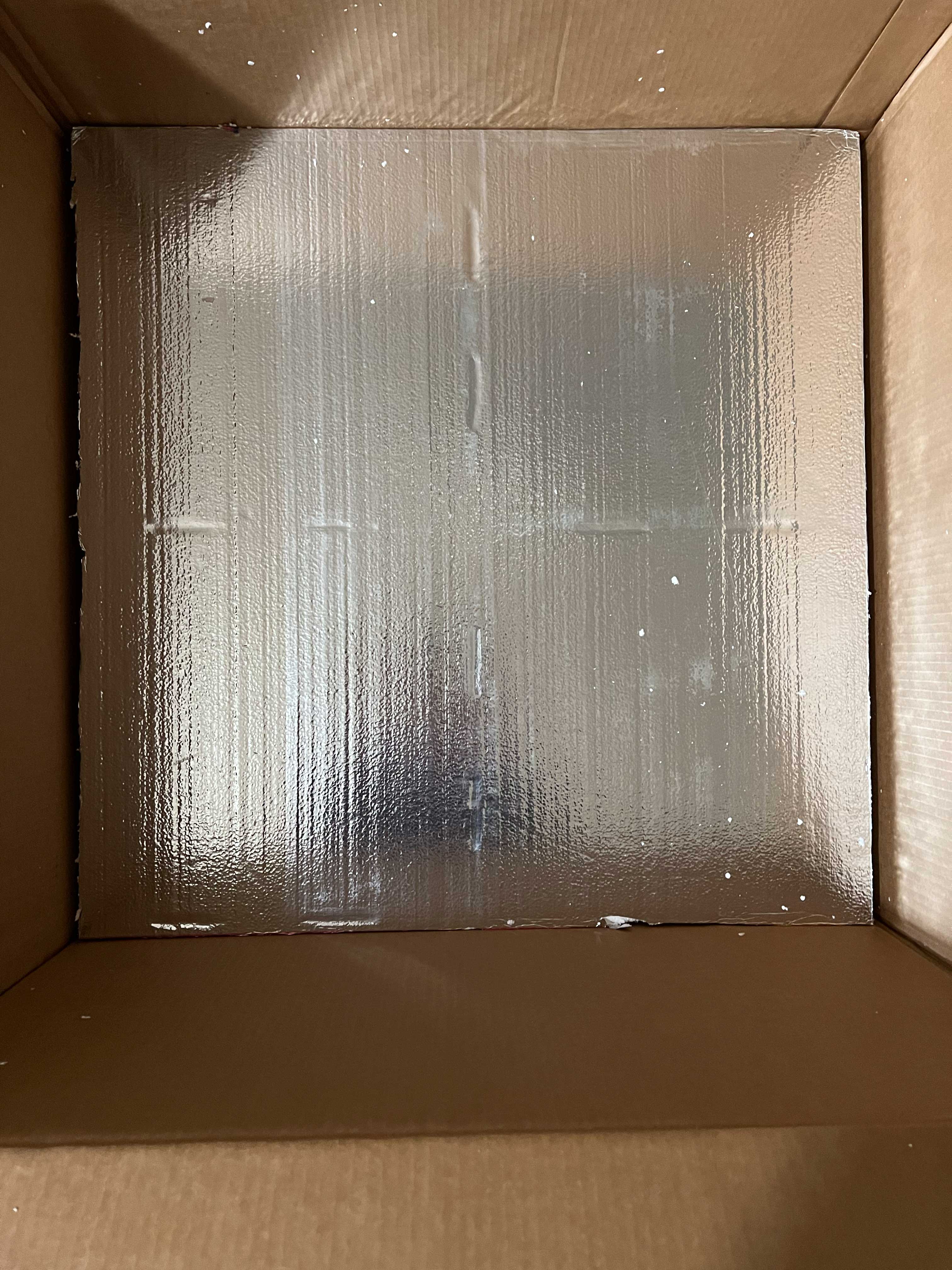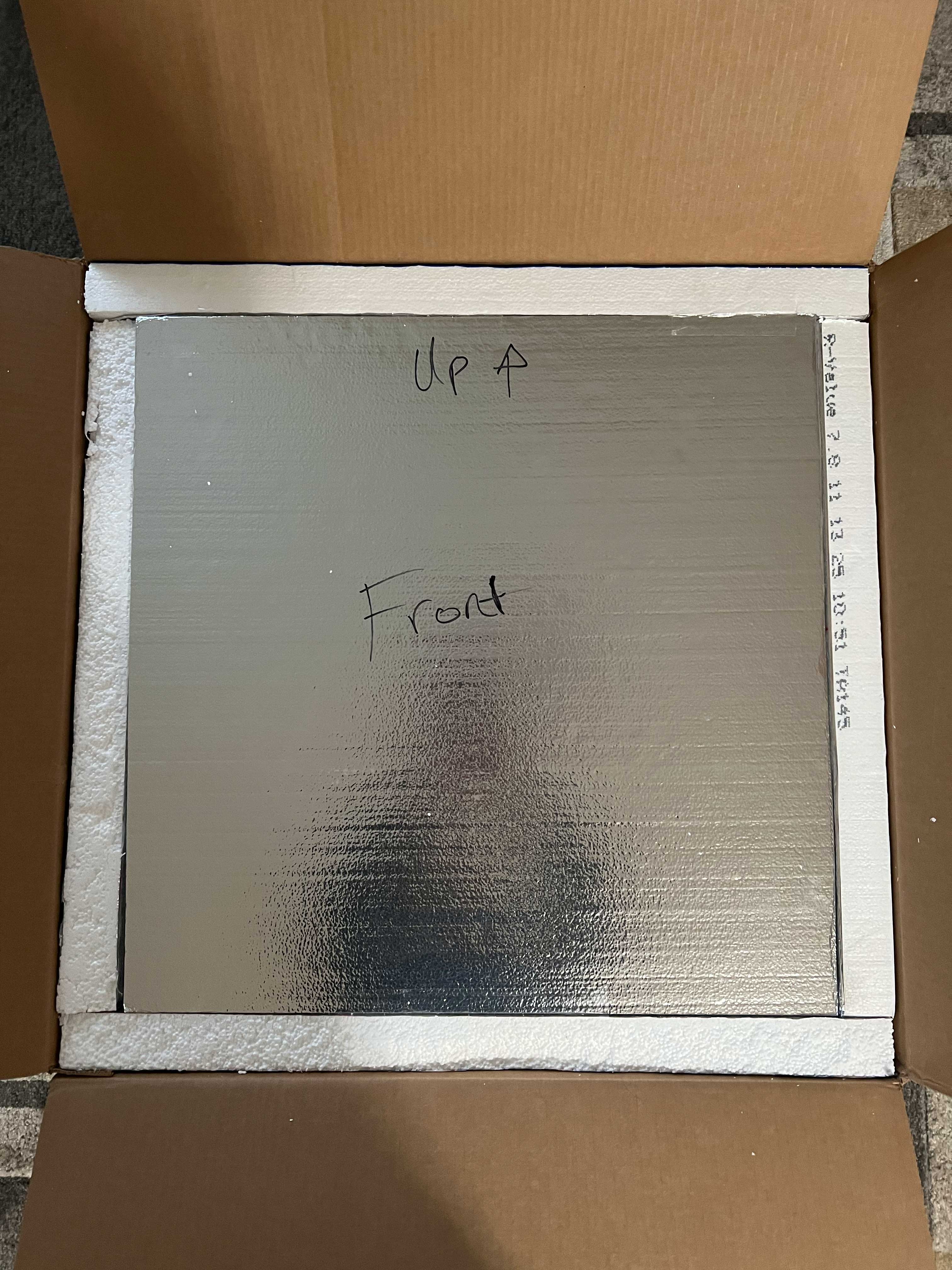 Looking at the indentations of the foam below, I suspect something heavy was likely placed on top and exerted downward pressure in shipment. Yet no damage could occur at all because the walls of the foam barrier were above the height of the cabinet when double-boxed, and the foam on every side made it impossible for any force to transfer energy.