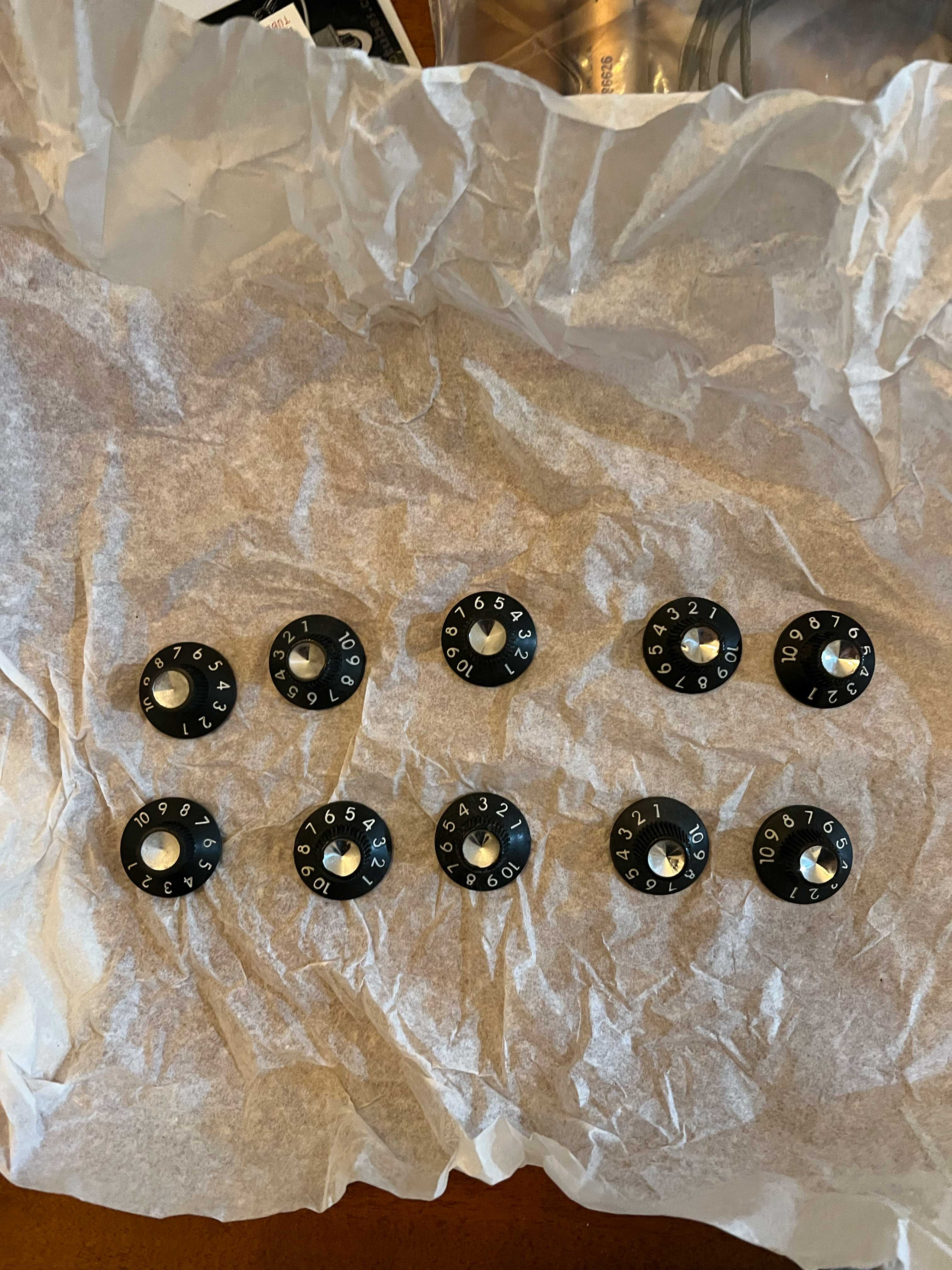 I didn’t show exactly how those knobs were padded in the process, but it involved two layers of of paper and they were all protected from weight and impact by anything else that could crack or otherwise damage the knobs. Two are non-original but the rest show the correct 1960’s snowman 8 font. All were laid out here to show they all arrived safely.